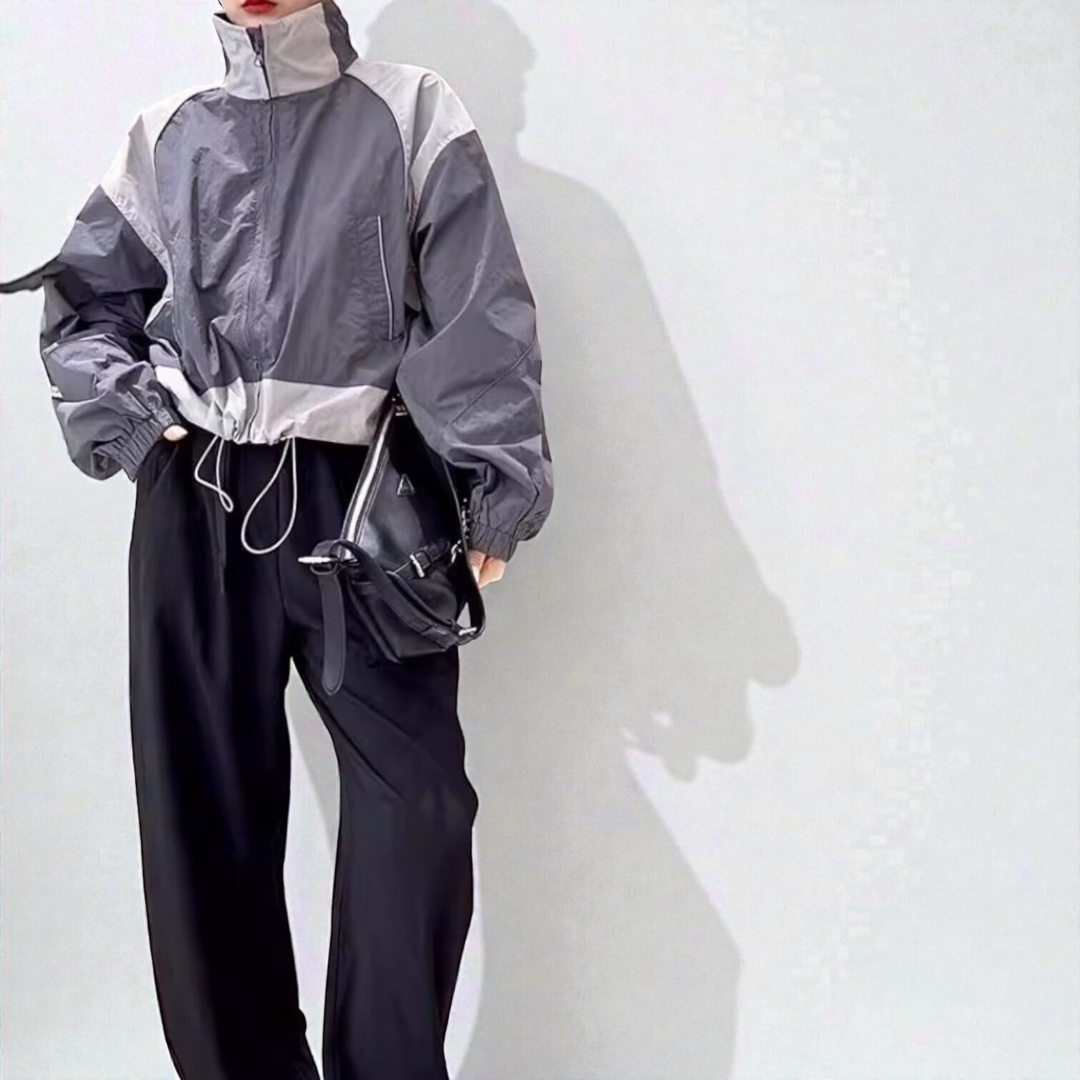 ・ スタンドカラーで小顔見え、スポーティ要素をプラス