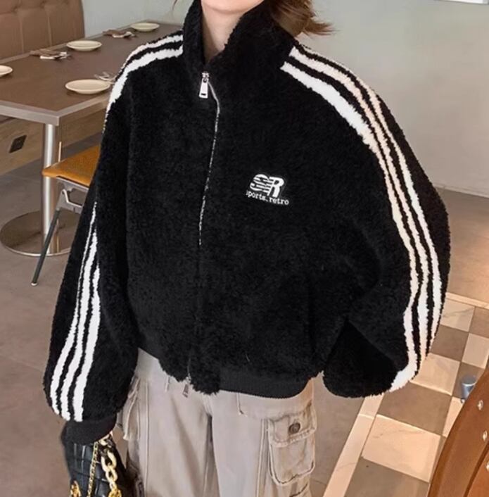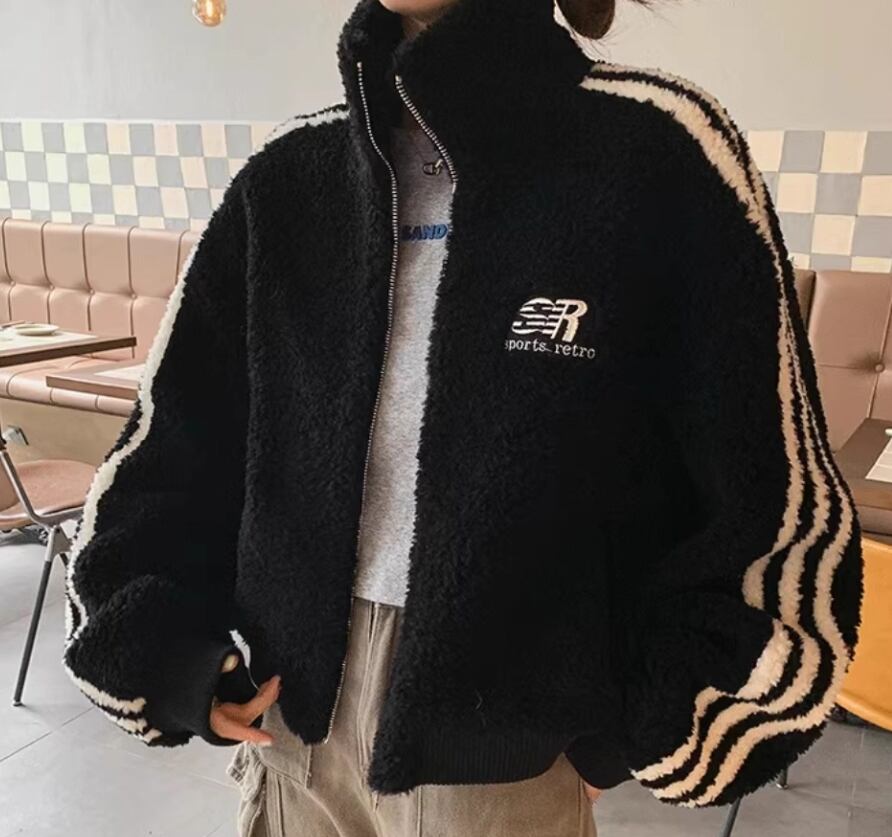 ふんわりしたボア素材に、レトロなラインデザインがアクセントの