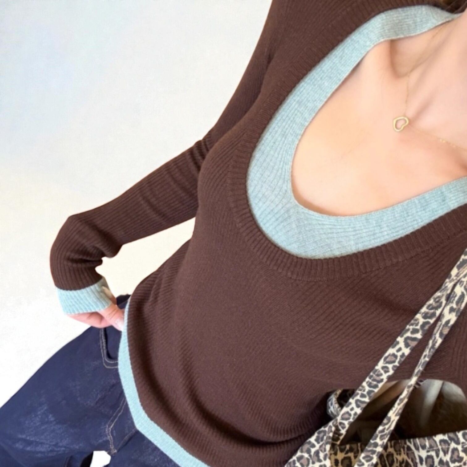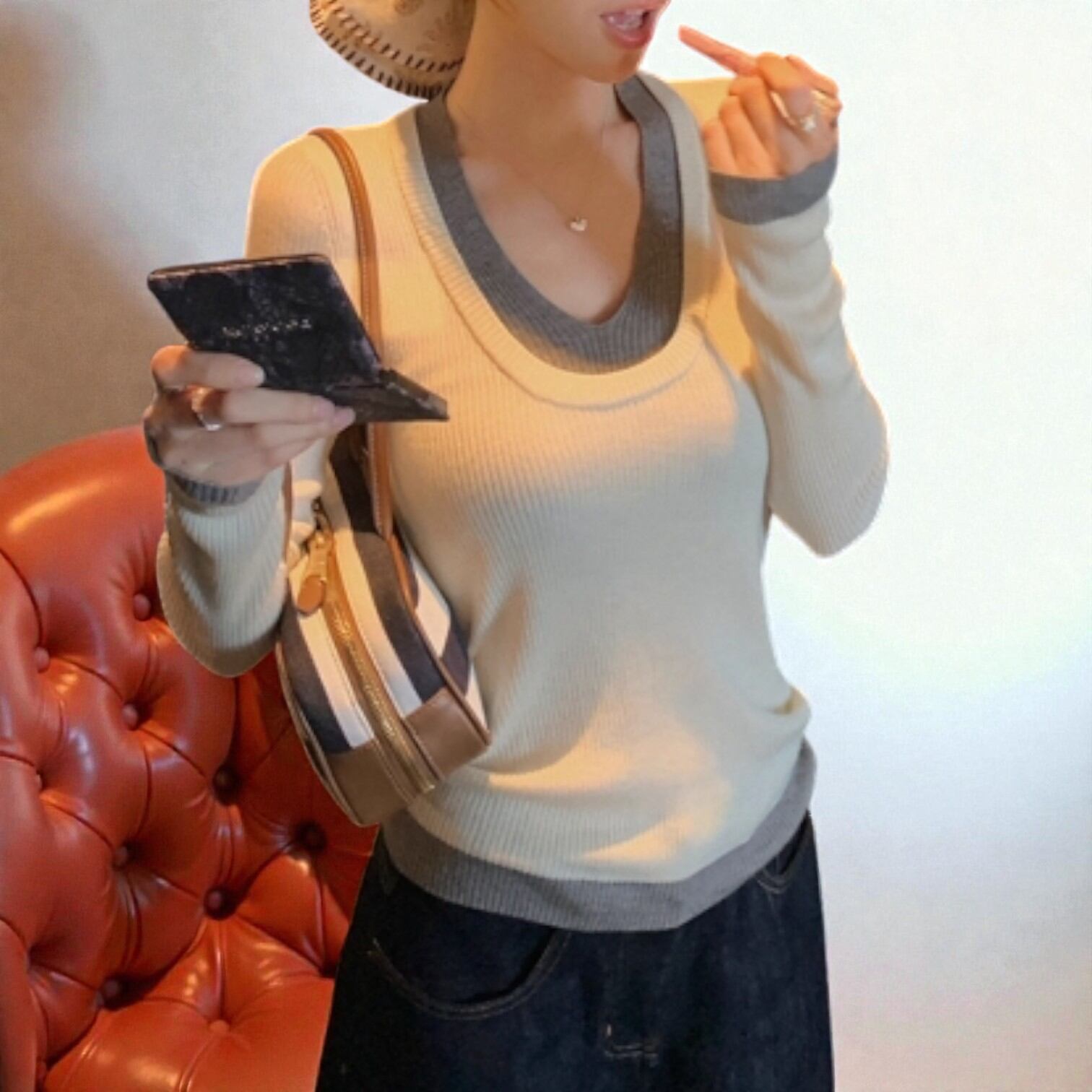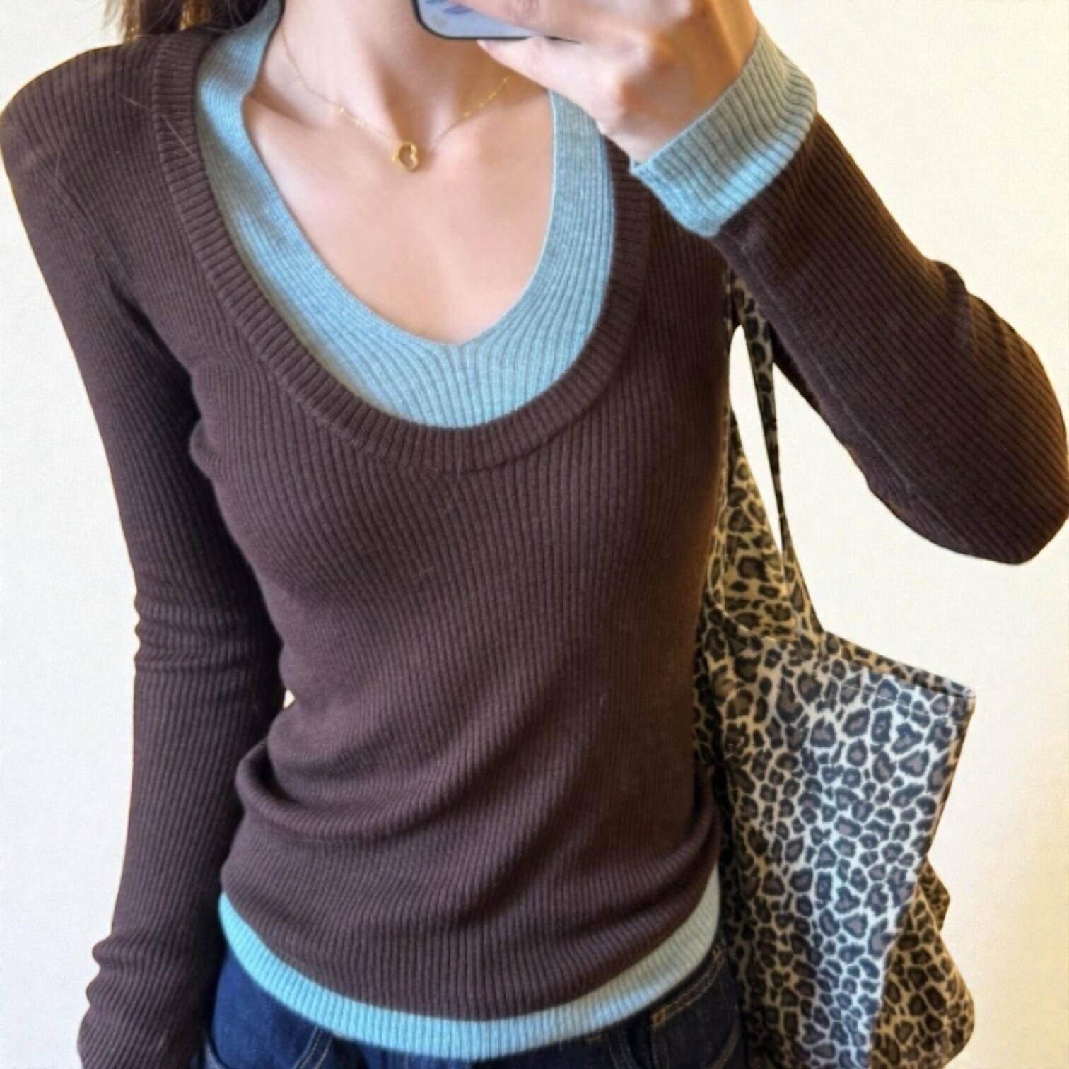 配色リブニットレイヤード風トップス 00018
