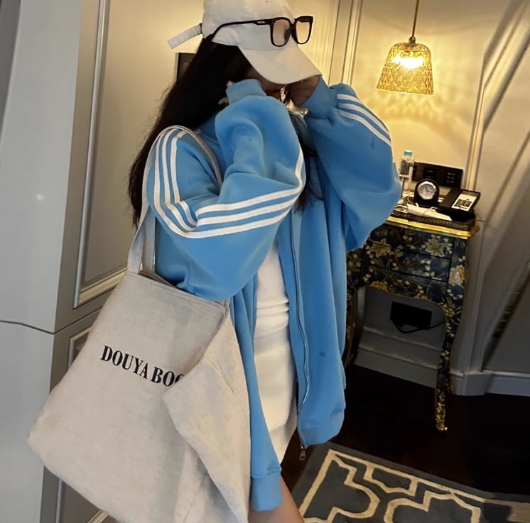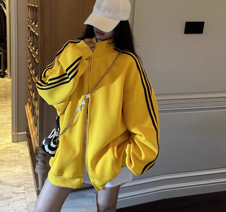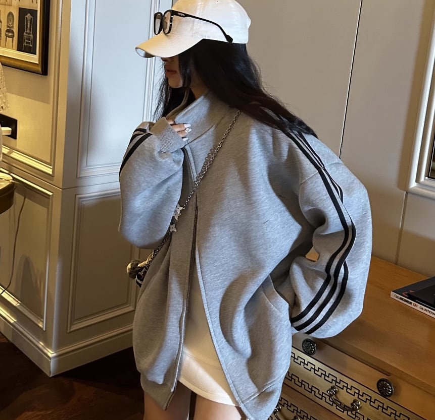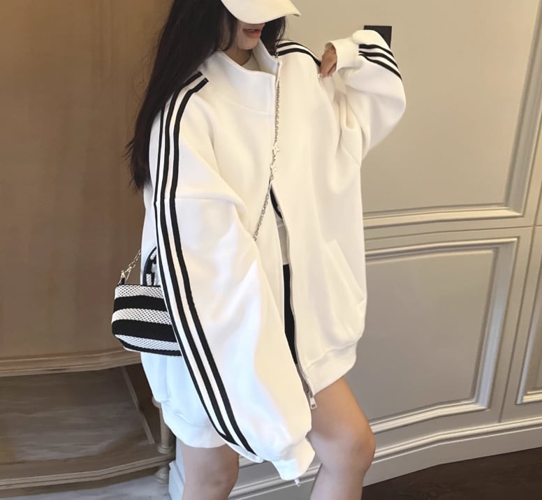ゆるっとしたシルエットがかわいい配色ラインのジップパーカー。